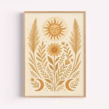 Boho Sun Wall Art – Celestial Floral Print for Bedroom & Nursery